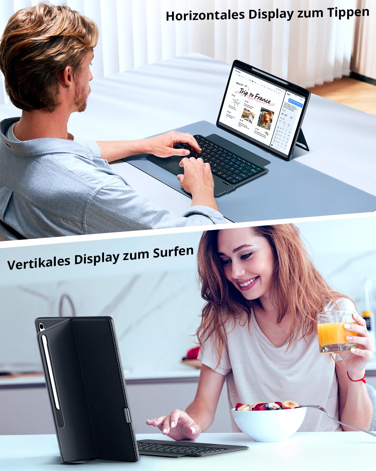 - Abnehmbare Tastatur und anpassbare Stellhalterung: Einfach die smarte Tastatur abnehmen, wenn sie nicht mehr benötigt wird und mithilfe der flexiblen, um verstellbaren Stellhalterung aufstellen